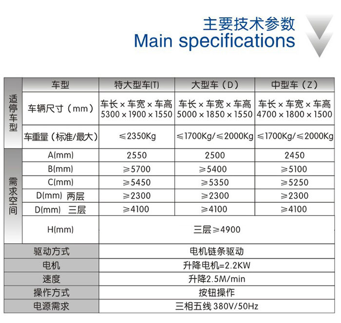 ●升降驱动系统为三排20A大链条提升,运行平稳可靠,保证车辆升降安全。